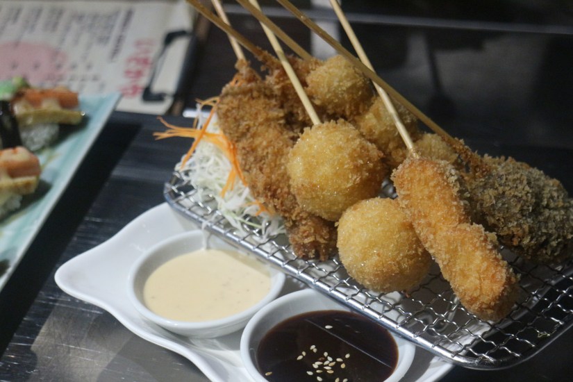 Kushikatsu – deep-fried skewered beef, pork, chicken, shrimp and vegetable. Fun, yummy sticks you can share and pair with alcoholic drinks.